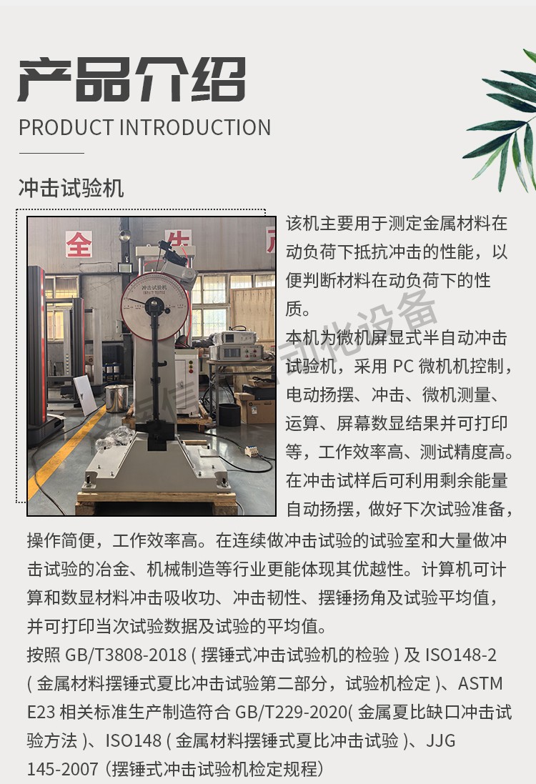 本機為微機屏顯式半自動沖擊試驗機,采用PC微機機控制,電動揚擺、沖擊、微機測量、運算、屏幕數顯結果并可打印等,工作效率高、測試精度高。在沖擊試樣后可利用剩余能量自動揚擺,做好下次試驗準備,操作簡便,工作效率高。在連續(xù)做沖擊試驗的試驗室和大量做沖擊試驗的冶金、機械制造等行業(yè)更能體現其優(yōu)越性。計算機可計算和數顯材料沖擊吸收功、沖擊韌性、擺錘揚角及試驗平均值,并可打印當次試驗數據及試驗的平均值。 按照 GB/T3808-2018 (擺錘式沖擊試驗機的檢驗)及 ISO148-2(金屬材料擺錘式夏比沖擊試驗第二部分,試驗機檢定)、ASTM E23 相關標準生產制造符合 GB/T229-2020(金屬夏比缺口沖擊試驗方法)、ISO148 (金屬材料擺錘式夏比沖擊試驗)、JJG 145-2007 (擺錘式沖擊試驗機檢定規(guī)程) 四、主要技術指標: 1、沖擊能量:150J、300J 2、擺錘預揚角:150° 3、擺軸中心至沖擊點距離:750mm 4、沖擊速度:5.2m/s 5、試樣支座跨距:40mm 6、鉗口圓角:R1-1.5mm 7、沖擊刀刃圓角:R2-2.5mm 8、沖擊刀厚度:16mm 9、角度準確度:±0.1° 10、試樣尺寸:10×10×55mm 11、外形尺寸:2124 mm×600 mm×1340 mm 12、試驗機凈重:450Kg 13、電源:交流三相 380V±10% 50HZ 5A 14、環(huán)境條件:周圍環(huán)境中無腐蝕介質,無震動,無強電磁場干擾。 五、設備主要配置: 1、300焦耳主機一臺; 2、150J、300J 擺錘各一個 3、取擺傳動裝置一套(裝在主機上) 4、自動掛擺裝置一套(裝在主機上) 5、保險機構一套(裝在主機上) 6、安全防護裝置一套 7、擺錘拆卸器一只 8、支座調校器一只 9、試樣對中器一只 10、聯(lián)想打印機一套 專用測量軟件一套