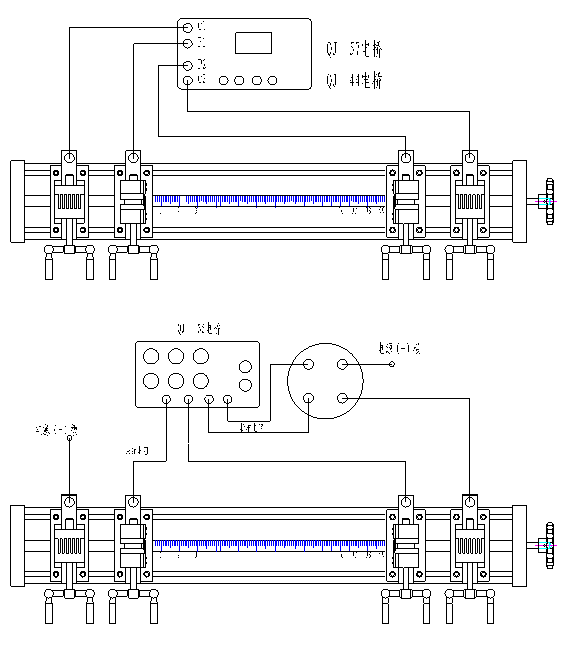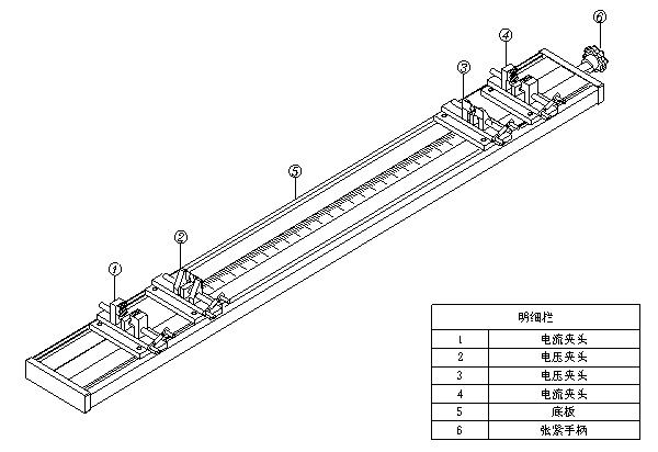 4、安裝試樣。旋開兩電流夾具,將試樣放于電流夾具①、④內(nèi),拉直試樣,并夾緊;旋動張緊手柄⑥拉緊試樣(用力不可過大);再將電壓夾具②、③輕輕夾緊直至有效接觸為止。