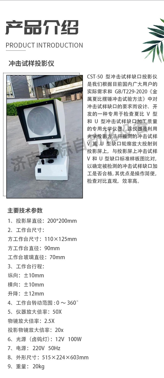 應(yīng)用領(lǐng)域 CST-50型沖擊試樣缺口投影儀是我們根據(jù)目前國內(nèi)廣大用戶的實(shí)際需求和GB/T229-2020《金屬夏比擺錘沖擊試驗(yàn)方法》中對沖擊試樣缺口的要求而設(shè)計(jì)、開發(fā)的一種專用于檢查夏比V型和U型沖擊試樣缺口加工質(zhì)量的專用光學(xué)儀器,該儀器是利用光學(xué)投影方法將被測的沖擊試樣V或U型缺口輪廓放大投射到投影屏上,與投影屏上沖擊試樣V和U型缺口標(biāo)準(zhǔn)樣板圖比對,以確定被檢測的沖擊試樣缺口加工是否合格,其優(yōu)點(diǎn)是操作簡便,檢查對比直觀,效率高。 三、主要技術(shù)指標(biāo): 1、投影屏直徑 :200*200mm 2、工作臺尺寸 : 方工作臺尺寸:110×125mm 方工作臺直徑:90mm 工作臺玻璃直徑:70mm 3、工作臺行程 : 縱向:±10mm 橫向:±10mm 升降:±12mm 4、工作臺轉(zhuǎn)動范圍: 0~360° 5、儀器放大倍率:50X 物鏡放大倍率: 2.5X 投影物鏡放大倍率:20x 6、光源(鹵鎢燈):12V 100W 7、電源: 220V 50Hz 8、外形尺寸:515×224×603mm 9、重量: 20kg 四、設(shè)備主要配置: 1.CST-50投影儀主機(jī) 一臺 2.底座調(diào)整鈕 四個(gè) 3.電源線 一根 4.鹵鎢燈 二個(gè) 5.平板玻璃 一塊 五、工作條件 a、環(huán)境溫度0-25oC范圍內(nèi); b、相對濕度不大于85 %; c、周圍無腐蝕性介質(zhì)的環(huán)境中; d、安裝在平整的地面上; a、環(huán)境溫度0-25oC范圍內(nèi); b、相對濕度不大于85 %; c、周圍無腐蝕性介質(zhì)的環(huán)境中; d、安裝在平整的地面上;
