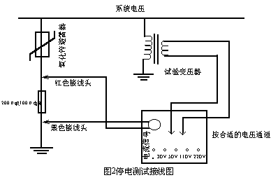 試驗(yàn)線路如圖 2所示。接線時(shí)請(qǐng)取一只 100Ω~200Ω電阻串在氧化鋅避雷器與地線之間,以保證試驗(yàn)回路聯(lián)通。