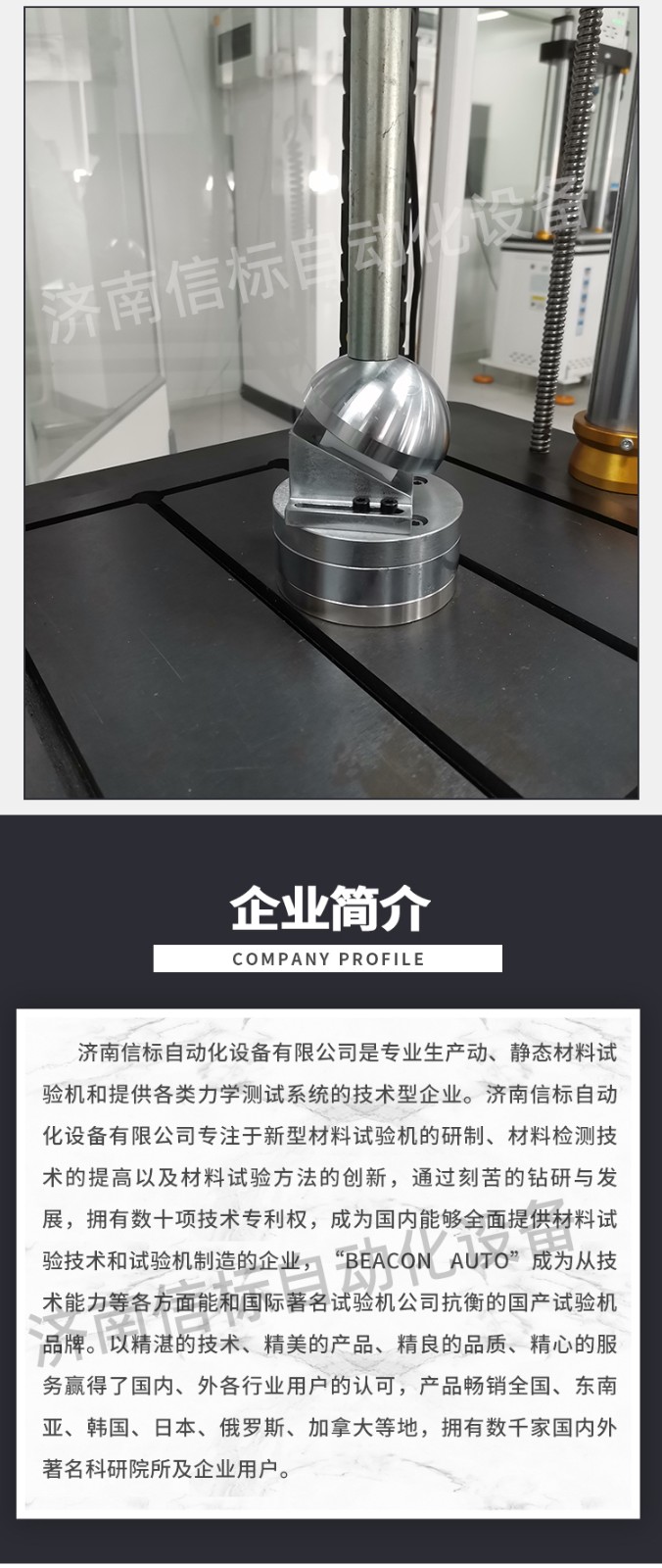 濟南信標(biāo)自動化設(shè)備有限公司主要生產(chǎn):動靜態(tài)萬能疲勞試驗機,接骨板彎曲試驗機,縫合線拉伸疲勞試驗機,髖膝關(guān)節(jié)磨損試驗機,電子萬能試驗機、液壓萬能試驗機、巖石三軸、四軸,電液拉力試驗機,材料試驗機,高低溫蠕變,高低頻疲勞,拉伸、扭轉(zhuǎn)、杯突等二十多個系列兩千多個的品種。